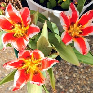 雨降りなので、昨日から軒下に避難中。 赤のチューリップはキレイに咲きそろいました🌷 青空の下にだしてあげたーーーい