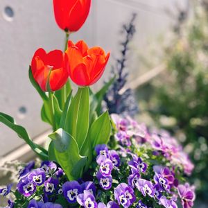 ビオラの寄せ植えに仕込んだチューリップの球根が開花!