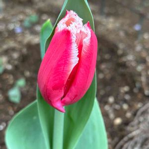 2023.3.28 Tuesday ☁️ 時々パラパラっと小雨が降り、肌寒い一日でした。 お孫ちゃんと球根植えをしたチューリップ。 真っ赤なお花ですが、縁取りが白色のフリフリです。 今日は生憎の曇り空 チューリップのお花はまだ開きませんでした。