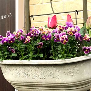 こんばんは🌇 チューリップ🌷をビオラと共にハンギングにしてみました 朝は蕾だったチューリップが夕方見たら 開いていました😃