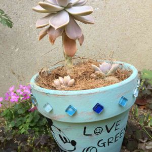 おぼろ月さん一家をリメ鉢にお引越し( ˘ ³˘)♡ ゚+。:.゚ 頭が重くてプラ鉢では耐えられなくなった母さんと葉挿しベイベーたちを1つにしました🎶 これで倒れる心配はないかな(´艸`)” リメ鉢は昨日せっせと塗ってミッキーをステンシルしました💕