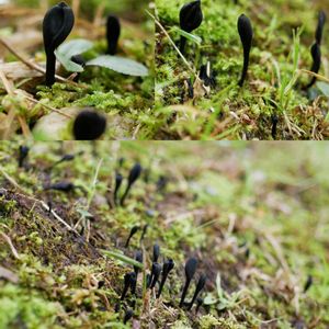 真っ黒で、怖いです。 何!? この軍団? 昨日の「黒(96)の日」 テングノメシガイ「天狗の飯匙」 テングノメシガイ科のキノコ 針葉樹林や広葉樹林の非常に湿気の多い場所の腐植やミズゴケの上などに発生します。 名前の通り細長いスプーンのような形をしている真っ黒なキノコ。 毒があるという情報はありませんが食用には向かないキノコだと言われています。 このスプーンで、飯を食べるのも止めときましょう。