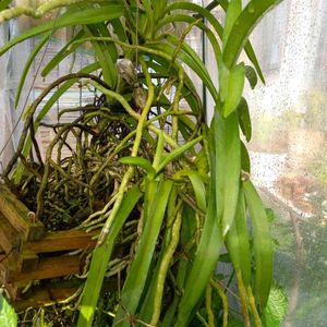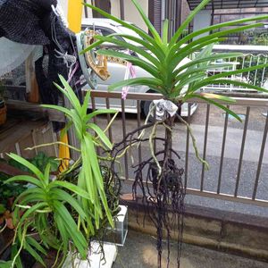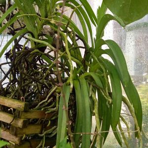 VANDA様特別ハウス内のV字VANDA 花芽は枯れましたが写真中央にお子さまが成長中。下から勝手に生えた大葉が繁ってます。