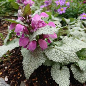 ラミウム ビーコンシルバーだと思われるシルバーリーフ 随分立派な花が咲きました。こんなに花大きかったかな 背後の棒はアブチロンの幹😊