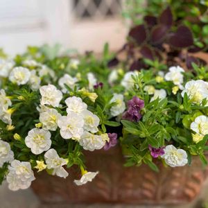 カリブラコア🤍 2階ベランダで順調に〜 と思っていたら チョコチョコ虫食いに… 特に右側🤔 ベランダにも 花がある事にとうとう気付かれて 下に持って降りてきました。 中央ワインぽいカリブラコアはワシャワシャ伸びて✂️ 後ろラミウム、コリウスも挿し芽っ子🌿 冬越し組みです。 なんだかバランス悪🤣