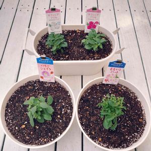 サントリーさんの苗を植付けました。 24センチの鉢に1株づつ グロウコンテナ中に2株 鉢の大きさはどうかな? 小さいかな? それより、目を話したスキにサフィニアアートを😺に食べられましたー😭 マイナスからのスタートですが、上手く育ちますように🙏