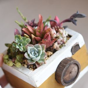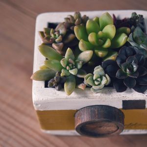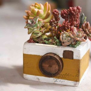 カメラ型のプランター 色とりどりの多肉を寄せ植えました