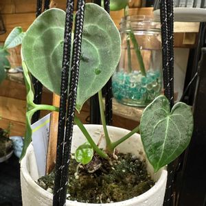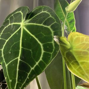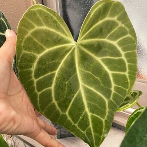 今日のアンスリウムクラリネルビウム😊丈夫でとても育てやすいです〜😊アンスリウム原種😊 花ではなく、美しい葉を楽しむ観葉植物の原種アンスリウムです。株ごとに微妙に異なる美しい葉脈入りの葉がなんとも魅力的です。原種のアンスリウムは世界に600種以上あり、地生もしくは樹木等に着生し、茎が蔓性になるものや、ロゼット状・直立するもの等があります。 花に観賞価値はほとんどありませんが、ワイルドで力強い美しさが魅力です。クラリネルビウムはベルベットの様な光沢の葉と銀白色の葉脈が美しく、ハート型の葉型が印象的です。一鉢飾るだけでモダンなインテリアになります。アンスリウムはとても丈夫で日陰にも強い植物。室内での管理もほとんど手間がかからず、手軽にお楽しみいただけます。葉が1枚出るごとに、高く直立する花茎を立ち上げ花を1輪咲かせます。