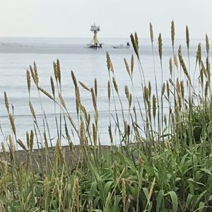 ☔️遠く相模湾を見ています この植物は何かしら?→カモノハシと教えて頂きました🙏更に調べたらケカモノハシのようでした😊 1キロ先にある総合実験タワー 波、水温、流向、流速、風向、風速、気温、雨量、気圧、湿度が観測されているそうです