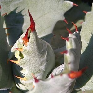 令和になってもオヤジは多肉狩り(¯∇¯٥) ② ●番号は実店舗で物を目にして手にとってのお迎え。 ○番号は \_ヘ(Д`*) カタカタ… (*´∀`)σ凸ポチッ 実際は平成ラストの落札でしたが届いたのが令和になってからですのでこちらにカウント Agave isthmensis "Kabutogani"marginata アガベ イシスメンシス ‘カブトガニ’ マルギナータ 和名:アガベ 兜蟹 斑入り お迎え:2019/ 5/ 3 撮影 :2019/ 5/ 3 発根促すために水苔巻いてます。2.5号鉢 室内撮影でちょっと色味が変わっちゃってます😅 カブトガニと言ったら【連棘】でしょ🤔 この大きさでもこの連棘。 探していた特徴が良く出ている個体に出会えました \(。˃ ᵕ ˂ )/ ✧*。 ♪⁽٩( ᐖ )۶⁾⁾ ₍٩( ᐛ )۶₎♪ ‹‹\( ˙▿˙ )/››‹‹\( ˙)/›› ‹‹\( ˙▿˙)/›› 「大きくなったら連棘出るよ」 なんてヘタレな私に出せるわけないじゃん <(๑¯﹀¯๑)> エッヘン!!?ナゼエバル この後、連棘維持できるかは育て方次第……だ、そうです (´・ω・`;)ハァー・・・ 極端な話、連棘であれば斑が入ろうが入らまいがどちらでも良かったので斑は不鮮明です( ¯―¯٥) 注)ポタトルム ベルシャフェルティ(怒雷神)の連棘を兜蟹とすることもありますが、 そもそもポタトルムとイシスメンシスの関係もはっきりしてないようなので、 私見として連棘が著しい物を兜蟹としています。というより考えないようにしてます ('ロ'('ロ'('ロ'('ロ' )!!!