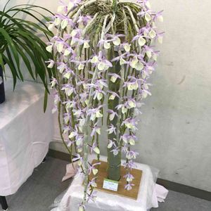 Dendrobium primulinumで、今はpolyanthumに統合された花です。花はNS6cmを超えていて、比較的大きな花が咲いたと思います。香りもスパイシーで、2015年の世界らん展の資生堂の限定香水にもなっております。 来年は50輪くらいを目指して頑張ります。