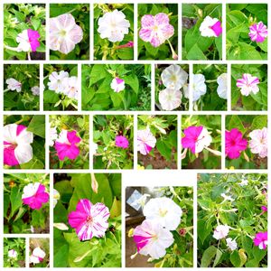 今朝咲いていたオシロイバナ🎊 ① 3色株から6個くらい咲いていますが、ほとんど白で、これだけほんのり赤、黄色の斑点あり その他、庭で咲いている数を数えると、まだ50個以上ありました🥰 特に、花壇の赤白は、真夏と変わらないほど元気です😊