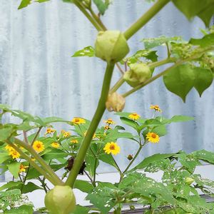 こぼれ種から育った食用ホオズキ😋 葉を犯した害虫🐛、黒い犯人見っけ👀 カメムシです‼️ 茎に十数匹も張り付いていました🤣