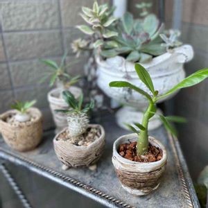 パキポディウム・デンシカウレ 右下 パキポディウム・ブレビカウレ 右上 パキポディウム・カクペチス 左上 パキポディウム・エブレネウム 左下 実生4ヶ月🌱 今年のパキポディウム実生は、6月に種まきと、遅めにしてしまったので心配だったのですが、 いい感じにまとまってる🤔 流石に外に出せなかったですが、この形で大きくなれば中々にいいかも😁 去年とかは徒長気味な株もあったのになんでだろう😗