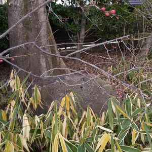 🚲️帰ろうと思たら あっ!紅梅♪ 右下にもかわいい花芽 常盤殿の植込みも 毎月 楽し🎶