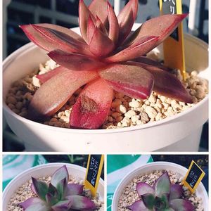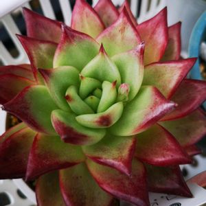 暑くなるにつれて黄緑が増えてきたエケベリアのロビン。赤の濃さに比べて黄緑が鮮やかな色なので目立つ存在。 熟れた果実が時間を遡って戻っていくようで面白い。