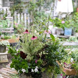 先日の土曜日は花遊びDay✨🦋✨ 過ごしやすい日だったので楽しい時間に なりました✨ エキナセア2種にニチニチソウ、カリブラコア、アンゲロニアなどの花を寄せました。 まだお花が少なめでちょっとさみしい感じ😌 リーフ類はヒューケラとミカニアが良い味を出してくれて渋かわいい💖
