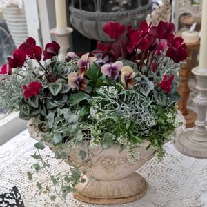 花遊びDay2つ目✨🦋✨ ガーデンシクラメンとパンビオで大人可愛いピンク💖 ちょっとクリスマスチック🌲 3枚目 いろんな色が混在している天の羽衣 4枚目 ピンクにパープルが滲んだ天の羽衣 5枚目 ヌーヴェル・ヴァーグは咲き進むと パープル→ピンクへ