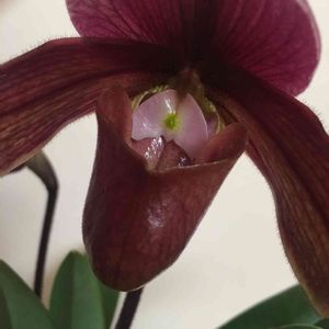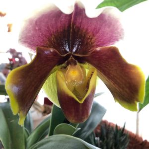 こんばんは☺️ 本日の新入りパフィオ Paph. Marilla Cuthbert パフィオペディラム・マリラ カスバート Auroreum (= lawrenceanum × venustum) x wardii こんな感じの交配種。 グリーンのタイプしか知らなかったのでこんな色もあるのかと。 ワルディー似の個体です。 いつも行く園芸店で年末に見かけて、年明けにあれば買おうと思ってたらしっかり残ってたので買ってきました😅 白花や黄花のパフィオは全部売れてましたが、やはり色合いが万人受けではないのか… 渋くてかっこいいと思うんですがね😊