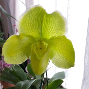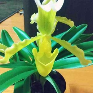 2年ぶりに開花の名無しっ子パフィオさん💕 もうちょっと黄色味が強かった気がするけれど…🤔 でもでも!咲いてくれてありがとう❣️