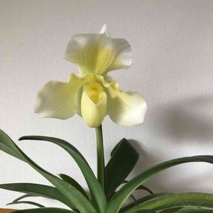 Paph.Alma Gavaert’Golden Gate’ 初秋から開花しました。 清楚な佇まいが大好きです。