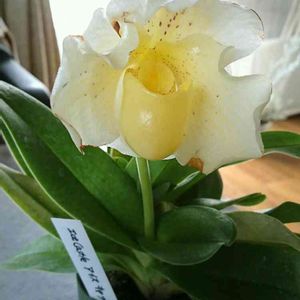 パフィオぺティラム (アイスキャッスル) 世界らん展で購入したパフィオ三点の一つ。 今はもう花は、咲いてませんが、白とクリームの清楚な色に惹かれました。 来年、花が咲く株があるそうです。楽しみ💕 蘭のことは、余り詳しくないので、ネットで調べてみると、アイスキャッスルは、単独ではなく、他の花と交配させてるのが、多いようです。