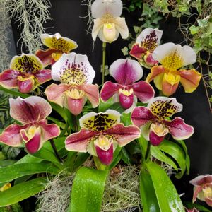 パフィオペティラム♥️ 半分5輪咲きました~💓 今年は10本も蕾が出て🎵 どれもみんな咲きそう~🎵 全部開いたら見応えあるだろうなぁ~🎵 楽しみです~(* ´ ▽ ` *)🎵