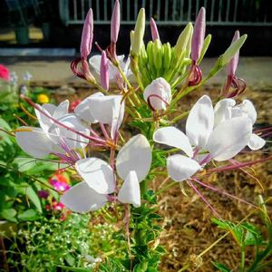 種から3本の発芽したクレオメに 前とは違う白い花が咲きました~✨ こちらの花びらは丸っこくてかわいいです❤️ 種から色違いが咲くなんて嬉しくて🙌 ε=ヽ( *´▽`)ノ