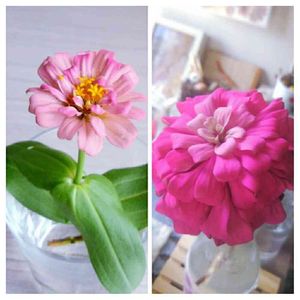 今年の種からのジニア(百日草)さん 最初はそれほど… 今はどんどん💓😍💓ハマり出しています✨ 左は茎が折れてキッチンで咲いてくれた優しい色の🌸 右は次のお花に場所をゆずり ✂️された🌸を玄関で**#☆ 色の変化に癒されます(*^-^)