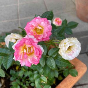 白いミニバラが可愛いな、と思っていたら、突然三つだけ、中の方がピンクの花になりました💕薔薇は不思議がいっぱい🌹 名前はわからないんです🥳 こんな可愛いお花のこと書いていますが、 実は今、恐ろしいほどの雷が鳴り響いていて地響きと間違えるほど、怖いです⚡️ 5月にこの雷は珍しいです、雨も激しいし☔️ バラ、大丈夫かな🤭 ちょっと、見てきます☘️🌹🏡