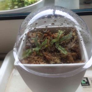 ネペンテスフーケリアナ2 こちらは少し枯れてきましたが、中央は元気です。 乾燥防止のためカップかぶせてます。