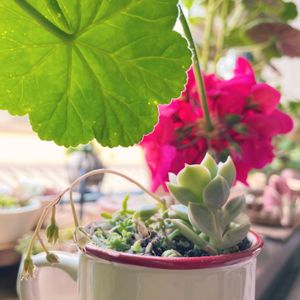 朝の窓ぎわ🌱🪴☀️ 観葉植物や、多肉植物や、お花たちが 朝の日向ぼっこをしているのを見るのが、 お休みの日のゆっくりとした癒しの時間です☀️ グリーンの中に、大きな花をつけた鮮やかなゼラニウムが いいポイントで、目立ってくれています🌺