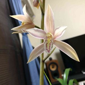 タイミング遅れの花ばかりじゃなく、たまにはリアルタイムの花を❗ シンビジウム 品種不明(園芸品種) Cymbidium cv. ラン科シュンラン属(シンビジウム属) 一月くらい前に、お隣さんが「友達に貰ったけど育て方が分からないから貰って!」 と言って、花芽があるにも関わらず置いていったシンビジウムです。 最近多くなってきてる、テーブルシンビジウムやミニシンビジウムと呼ばれる小型種じゃなくて、胡蝶蘭とならんで、よく贈答用にされていたタイプの大輪系大型品種のようです。