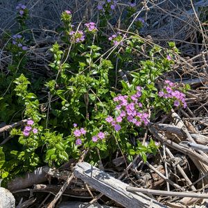 クルマバナ(車花) *シソ科トウバナ属 花期は8〜9月 北海道〜九州の山地の草原に生える多年草! 高さは20〜80cm 茎は4角形で直立しまばらに下向きの毛が生える! 葉は対生し卵形〜長卵形で浅い鋸歯! 花は上部の葉腋に集まって数段離れて輪生状に多数付け花冠は紅紫色の唇形花! ①萼には毛が多く 花喉部に毛も見えています! ②③名前の由来の車輪状の花! ④海岸のすぐ側の小群落❗️ 8月15日撮影