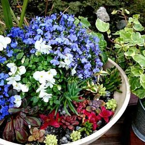 江の島サムエル・コッキング苑フラワーフェスタにて⑥ 苑内のいたる所に寄せ植えの草花も💠ブルーのお花と多肉植物の組み合わせが爽やかで素敵✨