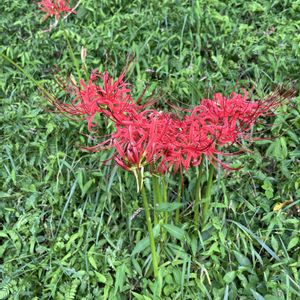 お彼岸ですねー。 ワン散歩で見つけました。子供の頃はなぜかお墓のイメージと一緒になって少し不気味な感じを持ってましたがよくみると繊細で真っ赤でかわいい花です。