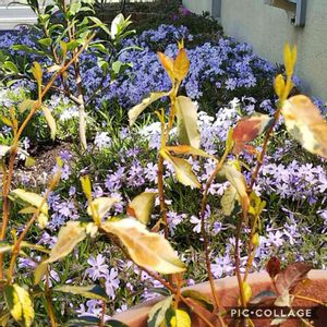 雨上がりのにぎやかな、お庭です✨✨😀 奥は、ピンクとストライプの芝桜が咲き待ちです🌸🌸