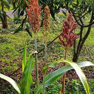 モロコシ イネ科モロコシ属の一年草(穀物) 別名 タカキビ(高黍) 原産地は、チャド東部~エチオピア東部にかけてのサバンナ地帯と推定されている。 お試し栽培なのか、3株だけ、 栗畑に生えていました。 葉っぱが、トウモロコシによく似ていますが、 実が違っています。 子どもの頃、実家で祖父がモロコシを栽培していたのを思い出しました。 竹製の箕(み)に、脱穀したモロコシを入れて、畑で殻やゴミを吹き飛ばしていました。 年末に蒸したモロコシを、ついたお餅に混ぜて、 モロコシ餅を作っていた記憶です。 茶色っぽい小豆色のお餅でした。 粟餅は、黄色。 ヨモギ餅は、緑色… 青のり餅も、緑色。 煎った落花生を混ぜた落花生餅。 小豆あんを入れた大福餅。 普通の白いお餅。 バラエティに富んだお餅を、お正月に食べました😆