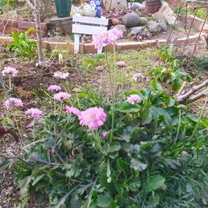 こんにちは😊☀️ 2年目❓️ピンクのスカビオサ が咲きました💗 蕾もいっぱいです🤗🌿 植え替えしないとぎゅうぎゅうです😁 Seriaのピックもあじがでてきました🐦️