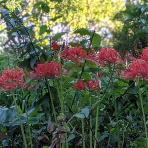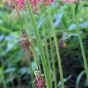 今朝の彼岸花です。お花はすっかり終わって先日実が垂れ下がっているのに気付きましたが、他の花後も見てみると、お花を付けていた茎?が6本のもの7本のもの8本のもの…色々あったんですね。 …日本の彼岸花は概ね種を作らないと書いてあることを花友さんから教わりましたが、それでもご実家では鳥さんが種を運んだのか、今迄無かった彼岸花が出て来たそう…。 この彼岸花も忘れず観察して行った方が良さそうですね。