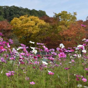 コスモス畑と紅葉 秋なんだなぁ〜(*ˊ˘ˋ*)。♪:*°🍁