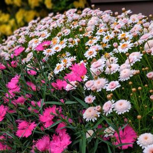 おはようございます😊 今日の我が家の玄関横! 上から ザンボマーガレット 爛漫ナデシコ イングリッシュ デージー ロリポップ 昨年秋、初めて3株づつ植えてみました! マーガレットがこんなに大きくなると思っていなかったのでナデシコに十分太陽が届きません! デージーは最近の暑さで弱る時もありますが、冬からずっと咲いている優れものです! 中々、夏の苗にバトンタッチ出来ません😅