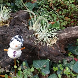 よっしー産流木の七福神が夏の暑さでカリカリになってしまったので、エアープランツのすみかにしました💚 なかなかいいでしょ😁⁉️ 月の雫ちゃんの⛄️ちゃんも庭の中にいると妖精みたいです🧚♀️
