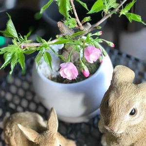 一日雨でした☔️ 今も音を立てて降ってます ソメイヨシノは満開だけど お誕生日に貰った旭山桜🌸は、もう少し ウサギさん達も一緒に開花を待ってます