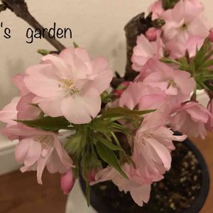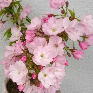 一才桜 旭山🌸 3年目になる八重咲きの桜の盆栽が今年も綺麗に咲きました(*´艸`*)🌸 1年目に比べると少し色が薄くなったような…😅 肥料が少なかったのかな…🤔? でも、優しい淡い色もかわいいかも😁💓 今日も1日お疲れ様でした😀🎶