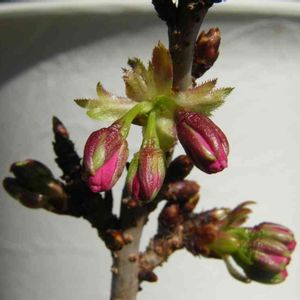 流れに乗って一才桜‘旭山’🌸 苗を買って和風鉢に植えて盆栽風にしたのですが、堅かった蕾がやっと緩み始めました😆🎶