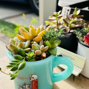 おはようございます☀ お気に入りのマグカップがヒビ割れちゃったのでせっせと寄植え😂🌱 多肉ちゃん達はみんなお外へお引越し🏃 焦がした事あるから心配だけど😂😂😂