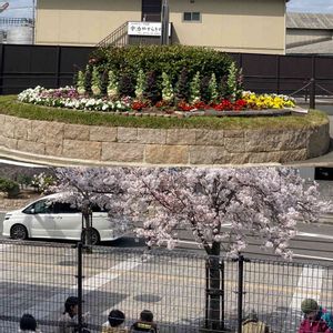2022年3月30日 水曜日 13:24 JR宇治駅北口前の花壇と桜 ソメイヨシノ(No.4😆)の前では親子連れと老婦人2人が花見を楽しんでいました