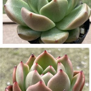 紅葉シリーズ🍁 エケベリア エボニー×ラウリンゼ ⬆️22年8月購入時 ⬇️4月1日 真冬は全く紅葉しなかったんですが、春になり少し染まって来ました♪これがピークかなぁ?