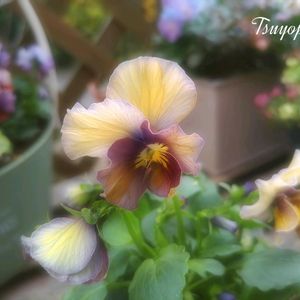 ピンク系の寄せ植えです。 ・うえたビオラ アンジュフルール ・コンボルブルス クネオルム ・プリンセスクローバー イザベラ ・班入りセリ フラミンゴ ・カルーナ ガーデンガールズ このビオラは花の形がとてもかわいいですね。 後ろに見えるのはエッグタルトです。